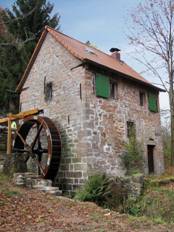 Ein Stück des Weges ins Hafenlohrtal hinein liegt die Gemeindemühle, die wir rechts bald erblicken, die seit 2008 wieder in Betrieb ist und über ein neues Rad verfügt, da das alte zerfallen war. Im Übrigen war der Zulauf zur Mühle trocken, da das Wasser der Hafenlohr sich so tief eingegraben hatte, dass der ursprüngliche Zulauf das Rad nicht mehr betreiben konnte. Die Gemeinde hat daher etwas weiter oben im Tal eine neue Verzweigung eingerichtet, so dass das neue Mühlrad oberschlächtig betrieben werden kann.