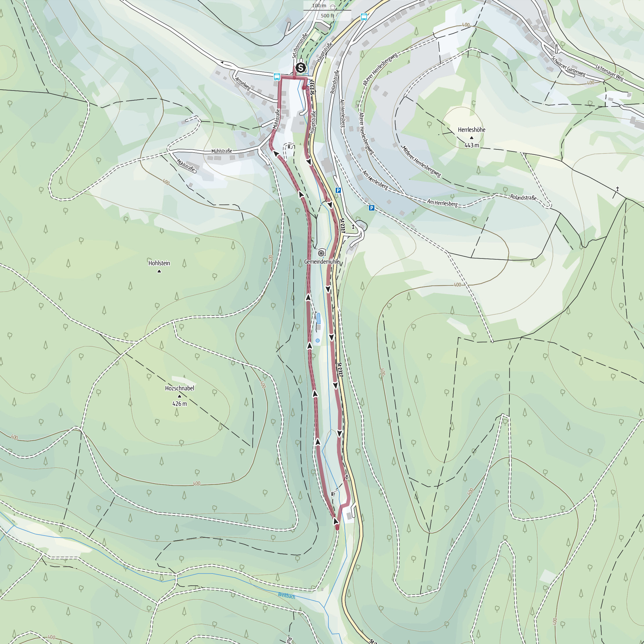 Im weiteren Verlauf des Weges findet sich links auf einem Betonpodest eine alte Seilwinde, die früher einen Skilift bewegte, der hier gegenüber dem im Tal emporragenden Hotelrestaurants Spechtshaardt betrieben wurde. Der Forstweg mündet alsbald in die Mühlstraße, die rechts weiter abwärts dem Ausgangspunkt wieder entgegenstrebt. Nach der Mühlstraße überqueren wir noch die Baumgartenstraße und sehen vor uns den Ausgangspunkt an der Setzbornstraße.